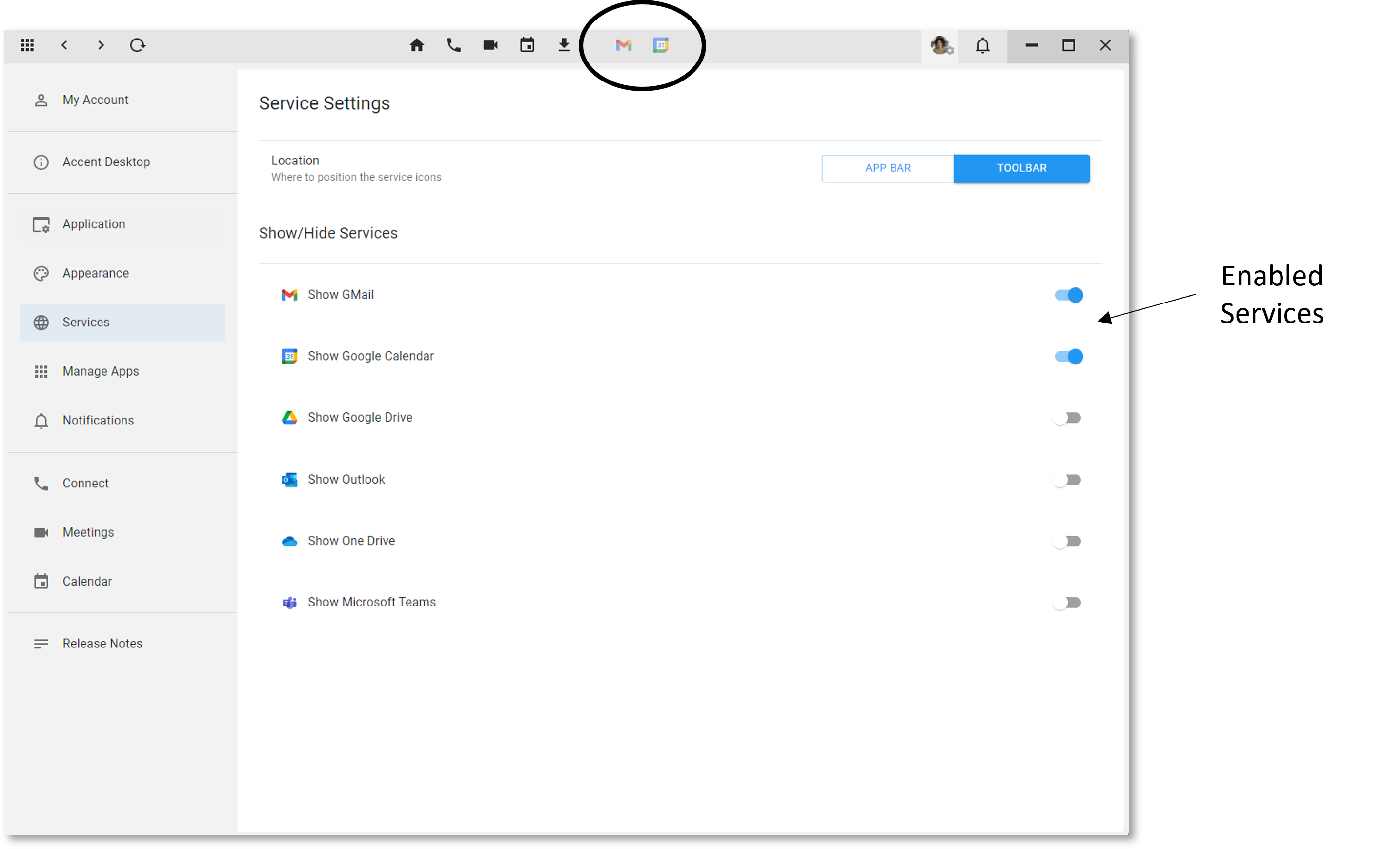 Once enabled, the services will be accessible via either the top navigation toolbar or the side [App Bar](https://guides.accentvoice.com/desktop-user-guide/apps/web-apps#app-bar), where the services are displayed is a configurable settings option.&#x20;